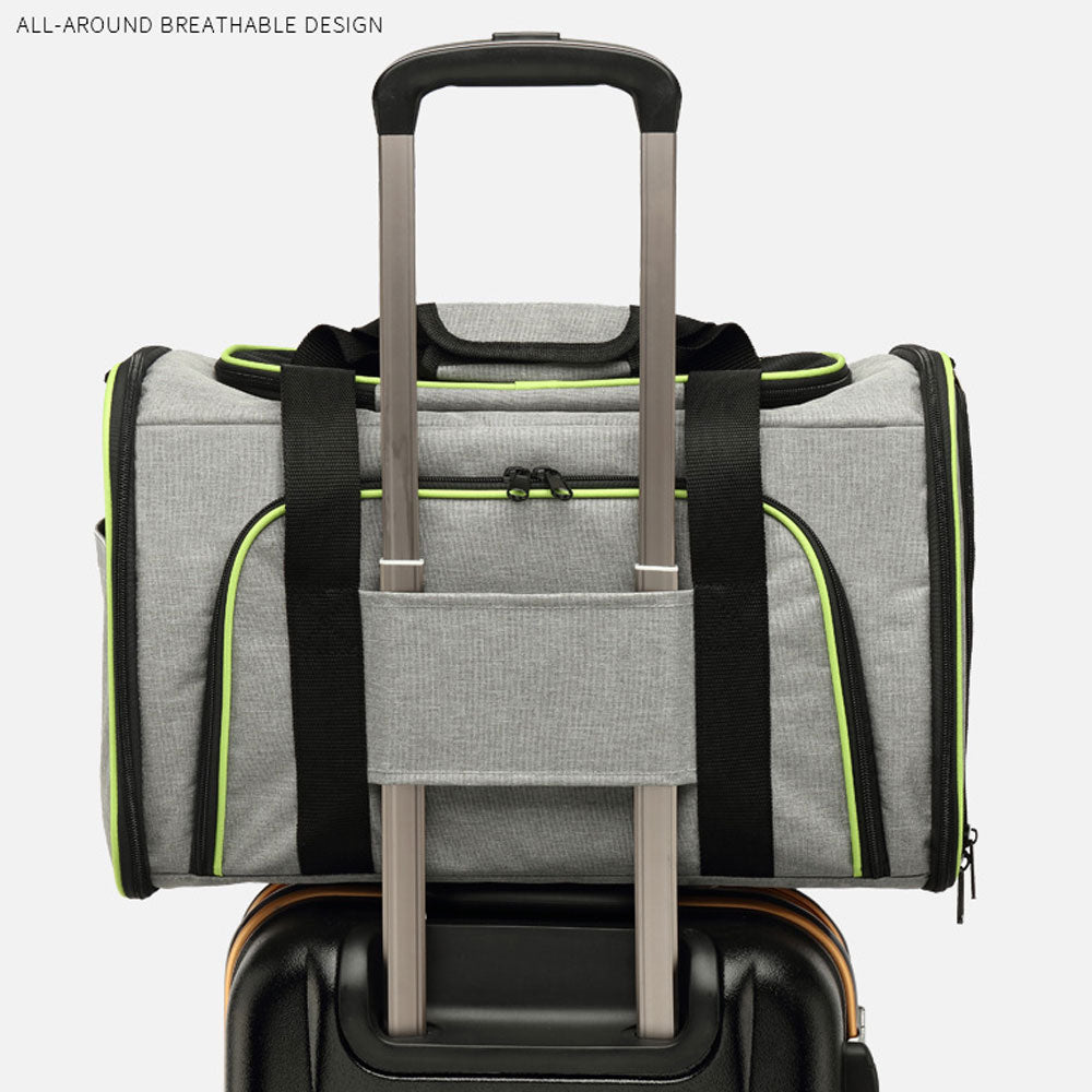 1.Large-capacity, strong and non-deformable inner lined with fiber rod support to ensure that the bag is not deformed. Fast and convenient travel, wide field of vision and portable. Zipper openings on both sides are convenient for pets to enter and exit, and can be easily folded. The bag is fixed on the trolley case.