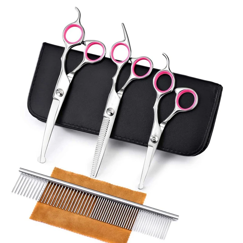 This kit includes 1 x Straight Scissors, 1 x Curved Scissors, 1 x Thinning Shears, 1 x Pet Comb, 1 x Cleaning Cloth, and 1 x Black Leather Case. With this kit you can trim any part of your pet such as body, face, eyes, nose, ears, tail, paw etc.